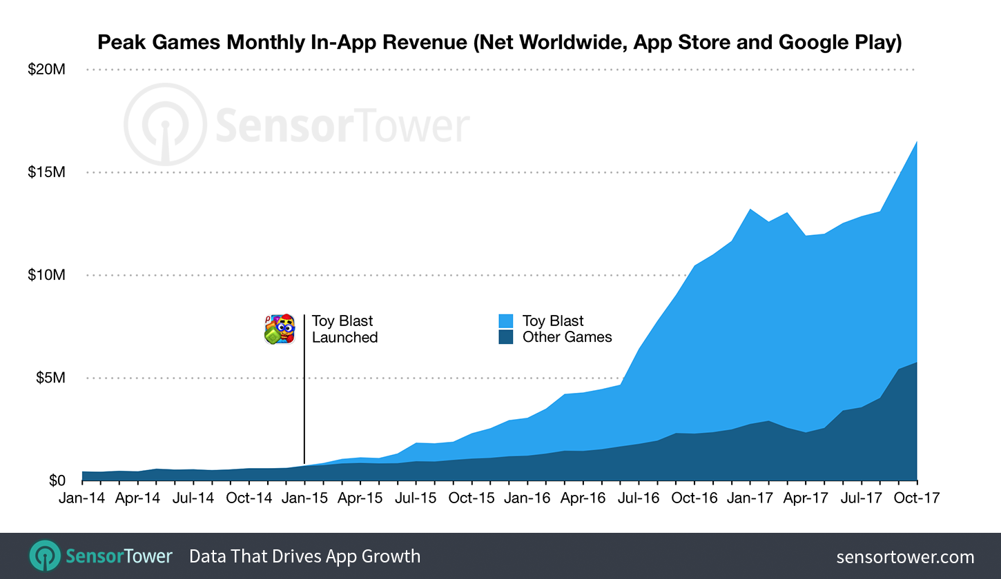 Peak Games has experienced sustained exponential growth after the release of Toy Blast in mid-2015. This growth is expected to continue powered by Toon Blast and the massive $100M war chest Peak gained from selling its card games to Zynga.