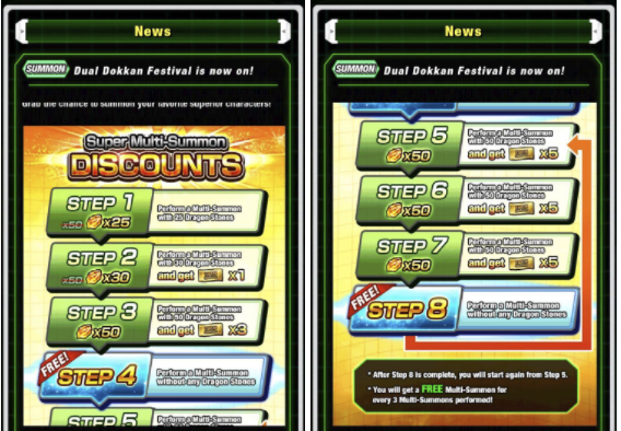You can see here, that players would get initially 40-50% off the cost of a usual multi-summon until reaching Step 4 which gave a free multi-summon. These were designed to get as many players deep into the sale as much as possible. Each Summoning type had their own step sales function — so you could get the 25/30/50 summon discounts first for Goku, and then again for Vegito. Players invested themselves in both sales to try to claim either top prize. After Step 4, players are given a free multi summon every 4th step, so any player in desperate pursuit of the unique content (and there was plenty) would attempt to take advantage of the “Buy 3 get 1 free” sale.