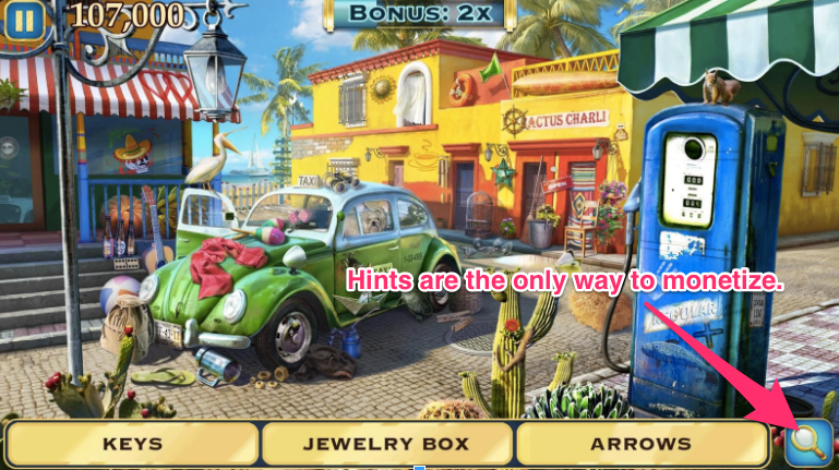 Hidden Object games typically monetize only through hints. Can’t find an object in the scene? Use a hint to let us guide you to the object. This helps players finish a level, but isn’t nearly as powerful a driver as +3 moves or in-game boosters in match 3 games. Why? Because hidden object games don’t have failure states.