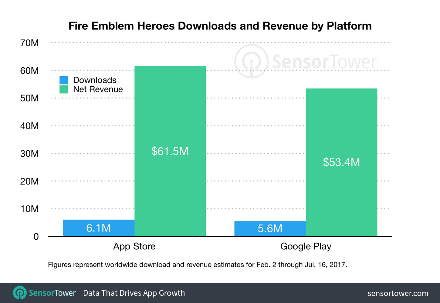 Despite Global featuring on both Apple and Google Play Stores, Fire Emblem Heroes has only had around 10M downloads worldwide, suggesting a lack of User Acquisition and niche appeal. Despite a lack of installs, revenue for the game hasn't slowed down.
