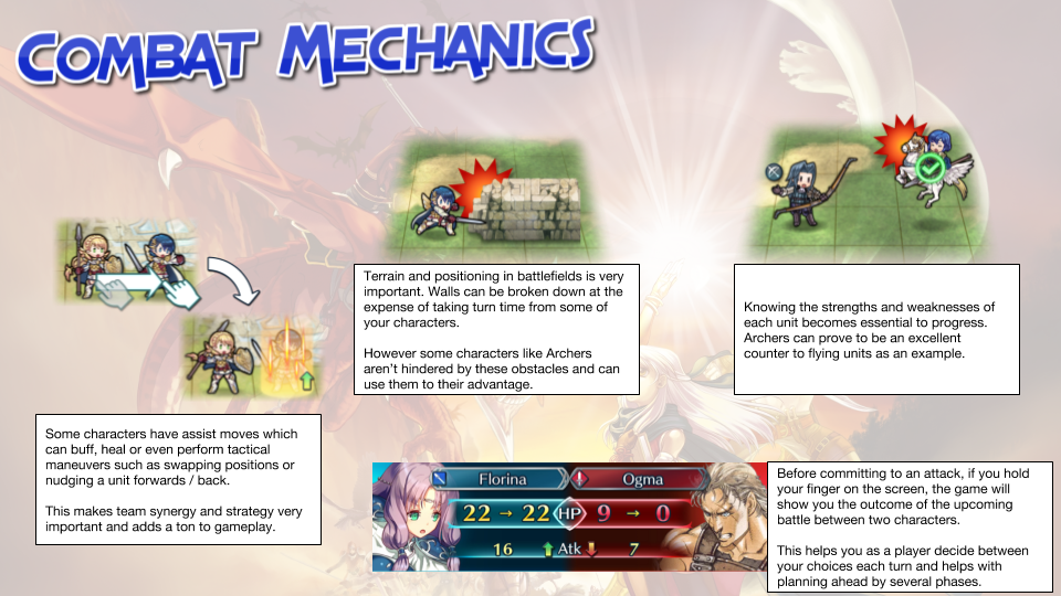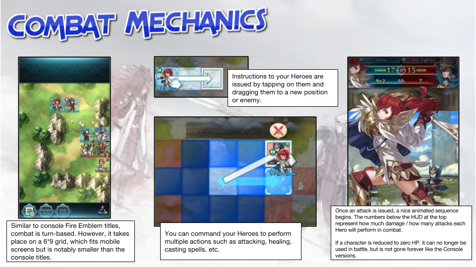 Combat in Fire Emblem Heroes feels very familiar to its console counterparts but well suited with good optimizations made for mobile. Battles take place on a 6*9 grid which is considerably smaller than on console. The game could have used multiple screens for larger battlefields, but it seems obvious that the game was designed to be playable with one hand and for short sessions, with battles resolving faster than the console equivalent.