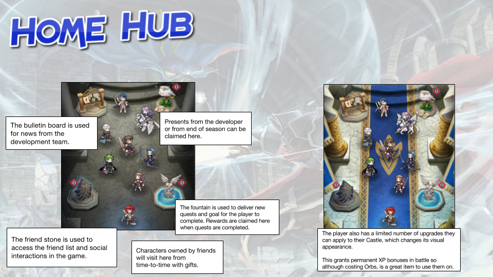 Many RPG games these days have a progression based element of a town or base that the player can invest in over time. Fire Emblem has something similar, although the amount of progression it offers is very little. Players have a Castle where some of their heroes stand and where they can interact with them (a nod to the more sophisticated stories of the console games). Players can also upgrade the appearance of their Castle to get permanent XP boosts to all of their characters. This is a no-brainer purchase and recommended for everyone, though it's fairly well hidden away. This means that the hub for the game is well presented and fun, and not just a boring menu, like some other games. The hub is also used to interact with friends from your friends-list.
