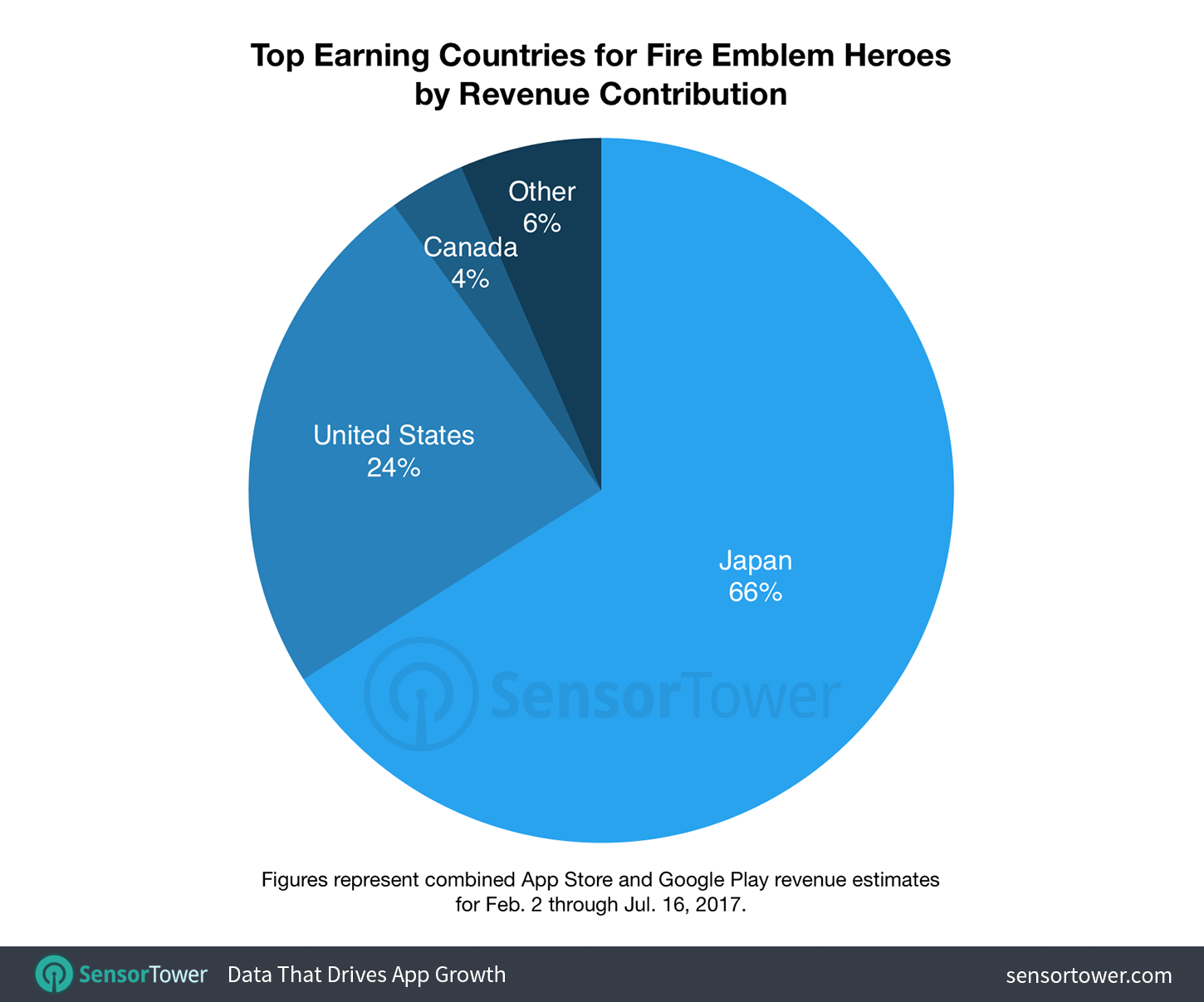 Around 66% of Fire Emblem Heroes' revenue has come from Japan, a largely unsurpsiing facet given the immense popularity of both the RPG genre and the franchise there.