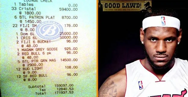 This is a bill for $170K for a single night out spent by NBA hall-of-famer Lebron James. I wished I was there!