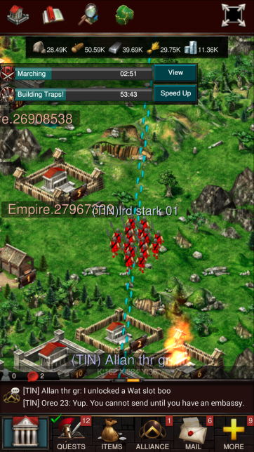 An army is marching towards an enemy city to attack it. 2:51 remain until the army reaches it's destination. The amount of time it takes to reach a target is a huge part of gameplay and balance in Game of War and mobile 4X games