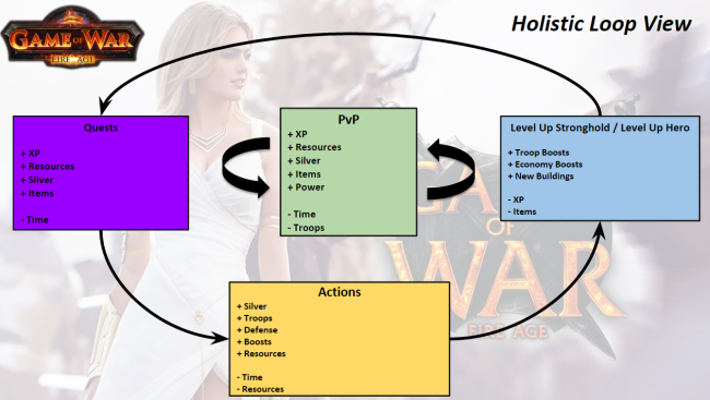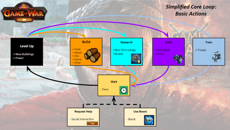 A simplified diagram of the absolute core actions in Game of War. The game is extremely deep, so it's hard to encapsulate everything on one diagram.