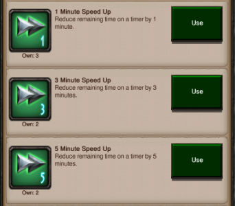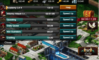 Players can also use speed-up items to speed up the timers in the game. Speed-ups are thrown about liberally in the game through rewards and from in-app purchase bundles and various kickbacks. These speed-ups are a clever piece of game design because they give the player an enormous power into how they want to play during their session.