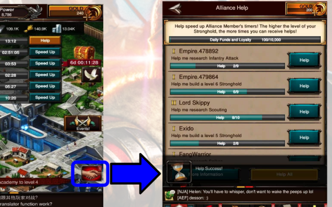 The player has a few options available to them to avoid waiting for too long. They can request help from their alliance members. The loop of requesting and giving help to alliance members is a core social interaction with huge value making alliances necessary to progress while also harnessing the power of social reciprocation and altruism to make players co-operate and build bonds between them. This encourages players to be online and playing the game as much as possible throughout the day. This is a great mechanic for building up engagement and meaningful interactions between alliance members.