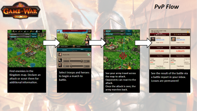 A brief look at how PvP works in Game of War. Notice how there is no actual battle. It takes place entirely within a spreadsheet and algorithm hidden to the player.