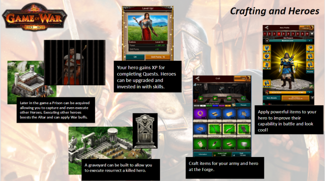 Another core mechanic in the game is that of developing the player's hero. Players are given a hero randomly, to begin with, who represents the player's general in the game world. The hero can earn skills over time and can be equipped with gear to make them stronger. Crafting itself is a super deep system into which players can literally spend millions of pounds and hours to get the best items to make them more powerful in the game. Players can also capture and even execute enemy heroes to gain buffs in their war efforts making for some awesome social dynamics. Think Jamie Lannister being captured by the Starks in Game of Thrones and the negotiation by Catelyn Stark to set him free.