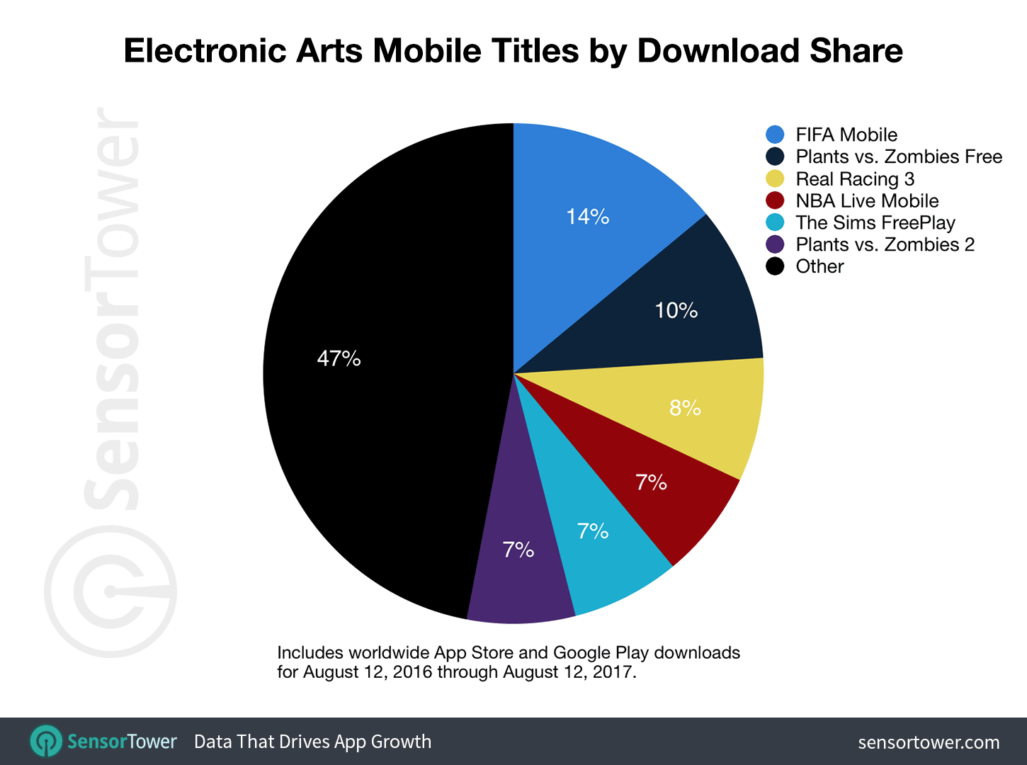 Unlike with most publishers, the correlation between downloads and monetization is not that strong with EA. What this means is, even when EA releases a game with poor metrics, like FIFA Mobile Soccer or Plants vs. Zombies Heroes, the company will still rack up massive amounts of downloads, which can be cross promoted to better-performing titles in the portfolio or monetized via in-game ads.