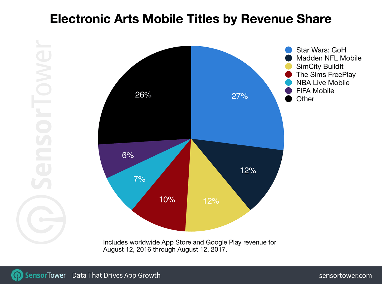 EA is a powerhouse on mobile with a broad portfolio of games in almost every possible category. Just like on the console, EA has built its presence on mobile via strong game IPs and their unrivaled competence in publishing new games. Till date, the company has enjoyed yearly growth in both installs and revenue driven by hit mobile titles like Sims FreePlay, SimCity: BuildIt, Real Racing and of course, Star Wars: Galaxy of Heroes.