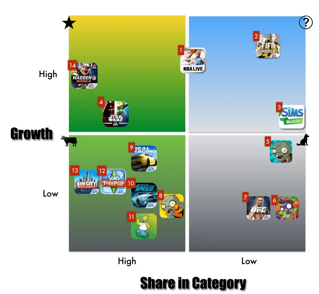 This modified growth share matrix is populated with EA's top 14 titles in terms of revenue and downloads from the last 12 months. The Growth axel represents a combination of downloads and growth in revenue. Share in Category is a combination of ranking in category grossing list as well as the contribution to EA Mobile's revenues.