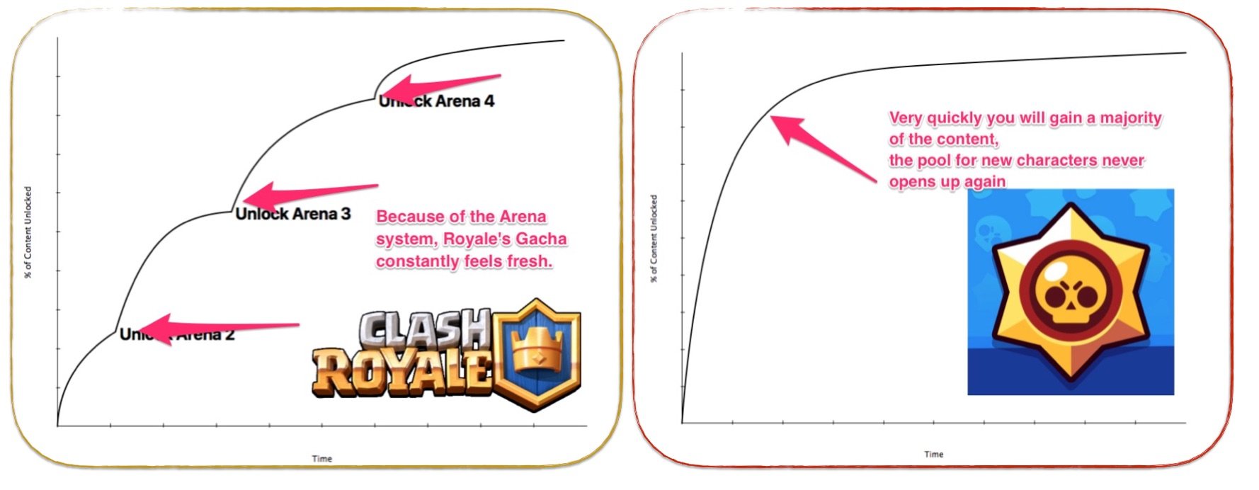 Clash Royale paces the content via Arena tiers. This not only drives the player to progress to the next Tier but also increases the size of the gacha pool, making cards a bit rarer. Because Brawl Stars had only 15 characters at launch, they were in an inflexible position and couldn't divide their pool into tiers. This led to quick saturation of content.