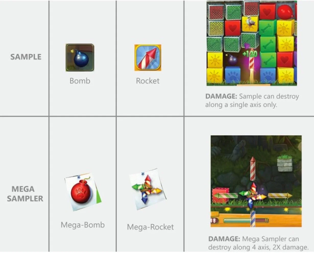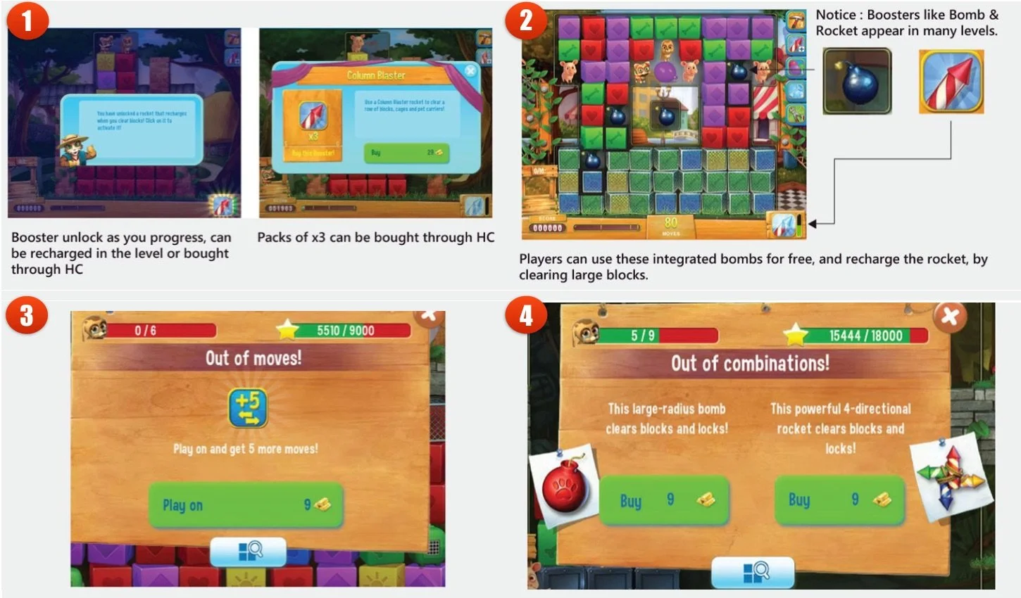 Pet rescue has many boosters but there are a few common ones displayed at various levels like the BOMB and ROCKET; that is not available for purchase in the game. In the early levels, if I fail, I would see the typical "Out of moves - purchase +5 Moves" screen. But this initial behavior changes over time. As players progress deeper into the game, failure screens prompt changes to accommodate new kinds of boosters - ones that cannot be equipped up front but are only available at failure screen.