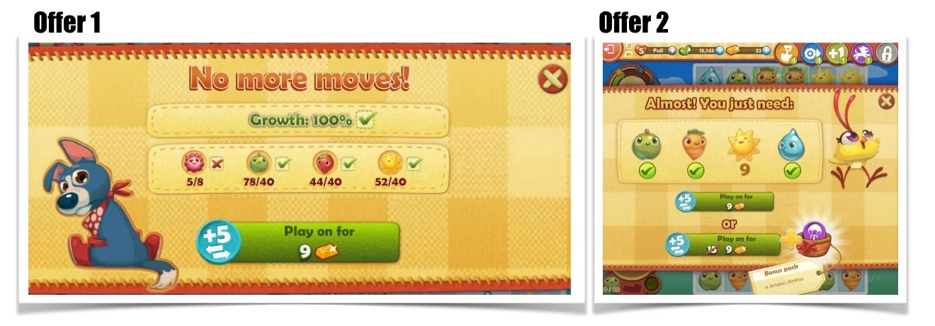 So, how can this real world model be used in virtual stores in games? Many free to play games have been using this lately. Observe the below example from Farm Heroes Saga, a typical match-3 game scenario. When player runs out of moves before completing a level, player receives a purchase message: