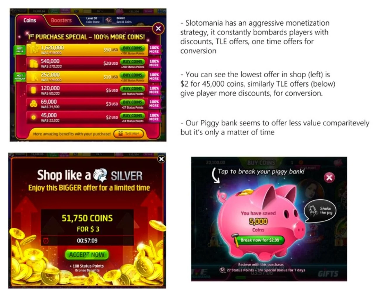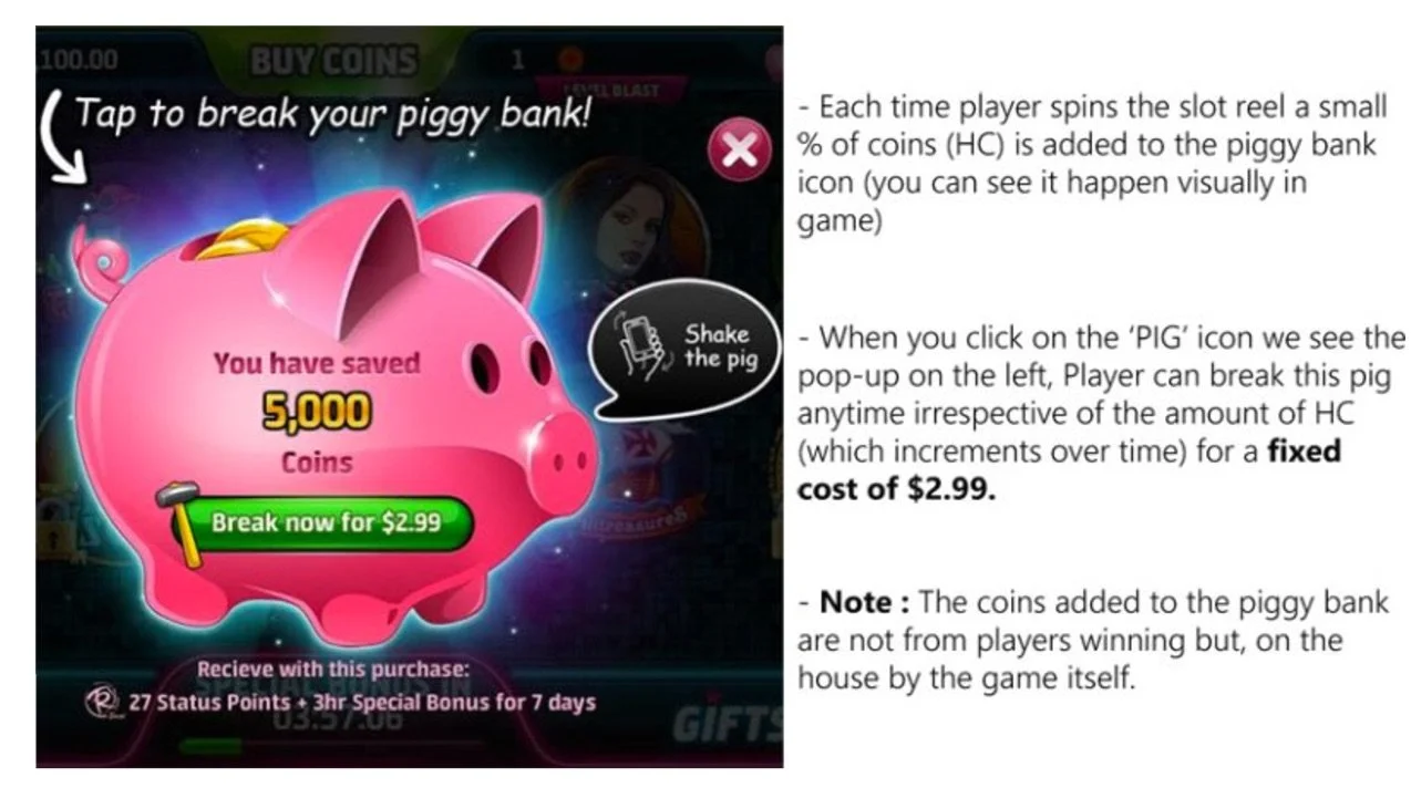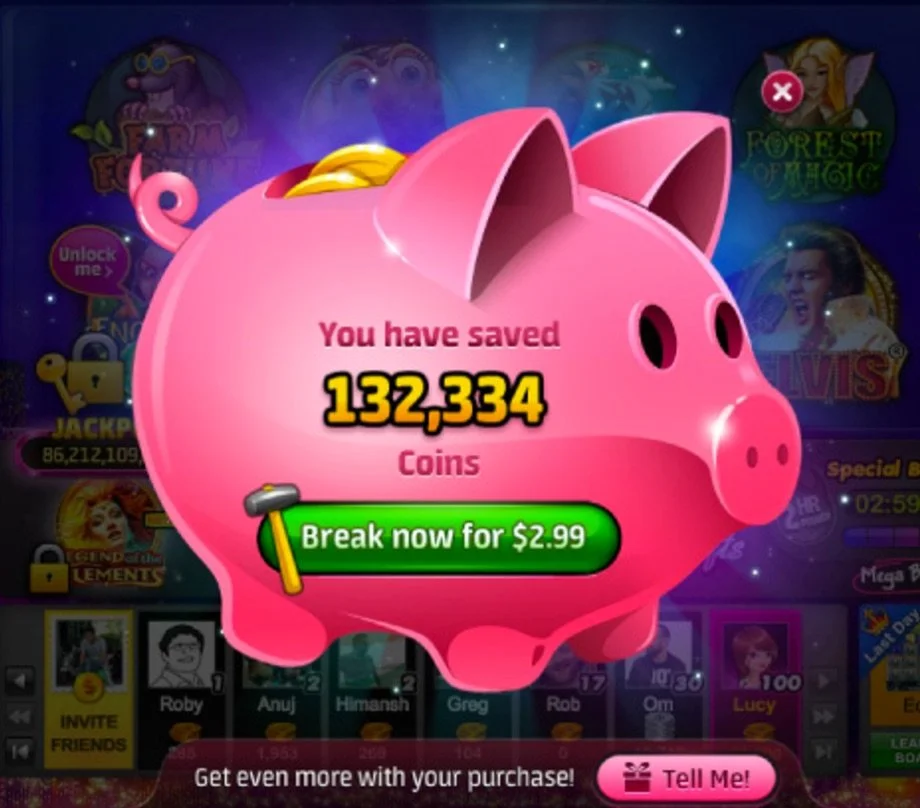 In essence, Slotomania creates an IAP that follows the mental model of a ‘Piggy Bank’ in real life. Player sees her efforts as Winnings + Time spent in the game =< the amount of HC the Pig holds. But how does this make the player feel smarter or different from any other IAP in the game? Why should player buy/prefer this offer?