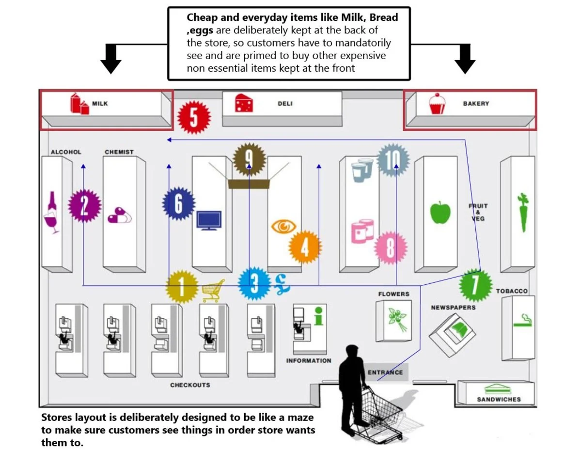 When you walk into a supermarket, you probably want to spend as little money as possible. But the supermarket wants you to spend as much money as possible and it's literally baked in to their design. As you have likely noticed, in any super-market or shopping centre, the most essential or daily use items are always kept at the back of the store. This forces the customers to go through and see all the high-margin items, which they were are not planning on purchasing.