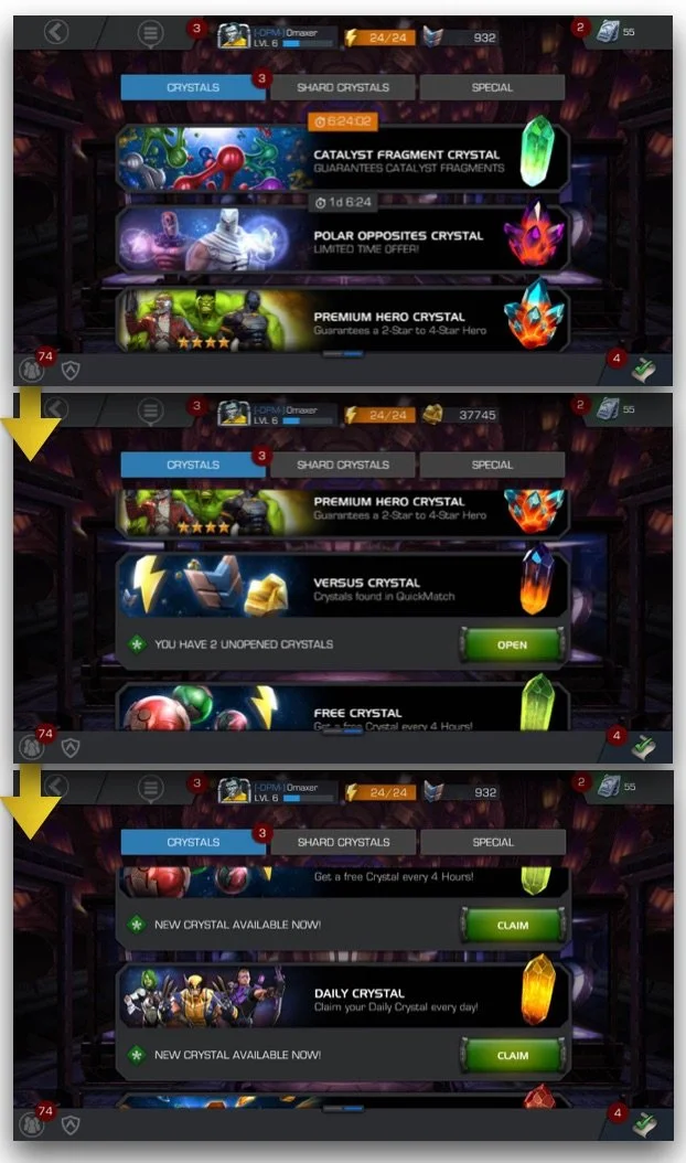 The idea here is to send the player as often to the shop/inventory space as possible, which is done by giving player free hourly and daily crystals. This ensures the player comes to this space frequently.