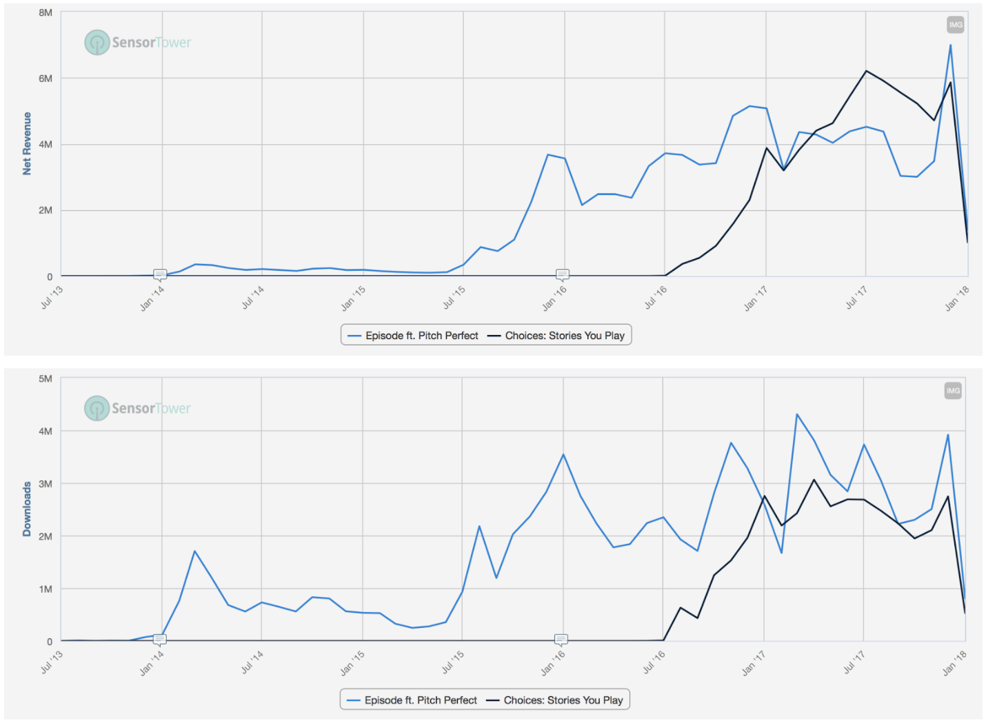 Pocket Gems’ Episodes and Nexon’s Choices offer almost a perfect example what the future holds for Glu. As you can see from the charts below, Choices was launched only a year after Episodes became a breakaway hit. While the combination of the two top performing games have grown the overall market, they’ve also increased the costs through their battle for downloads and rising production costs. Not to mention that Episodes is already seeking growth with IP partners like Pitch Perfect, which tend to further decrease the bottomline by taking a percentage of net revenue.