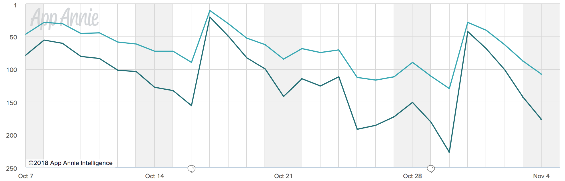 Thus far, roughly 40 days from launch, the game initially peaked on the US Top Grossing charts, but has since fallen. Now it is still falling from the Top 250 Grossing.