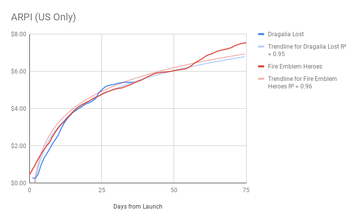 Accounting for install volume, Dragalia Lost has been roughly in line with Fire Emblem Heroes in terms of revenue per install -- so far.