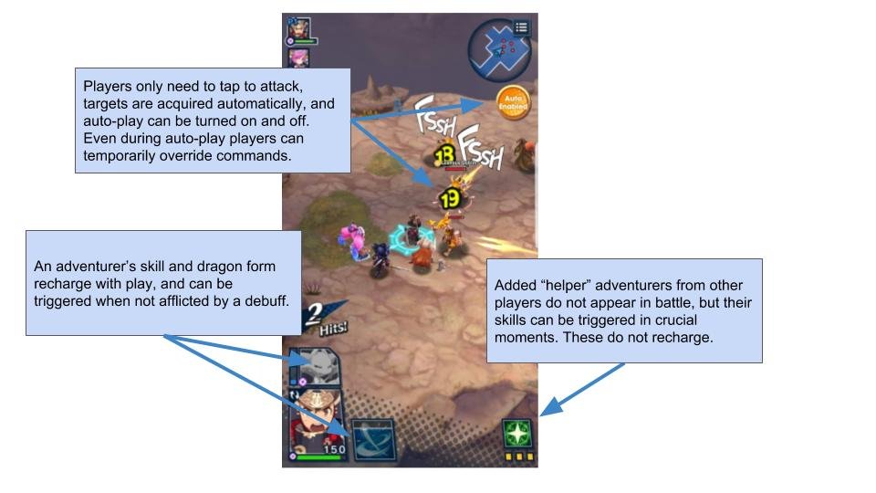 Players acquire adventurers from events and the gacha system, ranging from 3-5 stars in rarity. Adventurers have one of five elements (wind, fire, water, dark and light), and can each be equipped with a weapon, a Wyrmprint (essentially an upgradable ability) and a dragon form into which they can morph during battle.