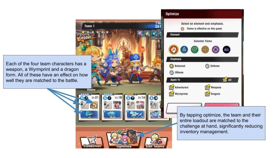 With four characters, each with three potential slots (weapon, Wymprint and dragon form), making the right choice can be a complicated undertaking. Cygames has, however, simplified the process massively by giving you an optimization button that tailors the setup to whatever is the most effective elemental setup at hand. This means the amount of character and item management is massively reduced compared to other games of this type.