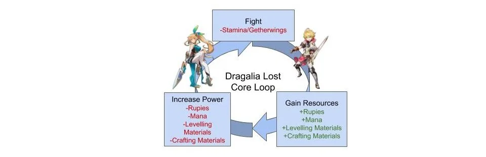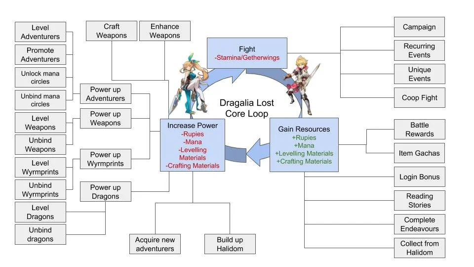 As you can see, the game follows the classical trinity core loop of fight - get resources - upgrade. Where many games keep this pretty straightforward and potentially expand in the future, Dragalia comes with an an astonishing array of of sub-systems. In fact, they apply almost every commonly successful meta progression system on the planet. With those systems added in, a game map of Dragalia looks more like this: