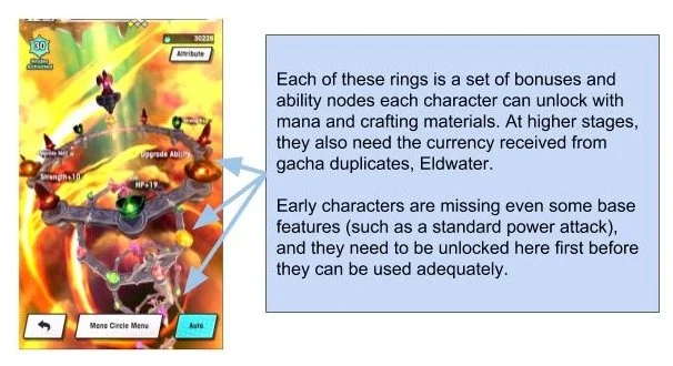 Additionally, each adventurer has a “mana circle” which is essentially a character's skill tree. It unlocks stat bonuses and skills, and it, too can be “unbound” using special materials only found on certain recurring weekday events. The amount of mana circles (and hence power options) depends on rarity, and lower rarity characters need significant amounts of investment to break their limits to unlock them.