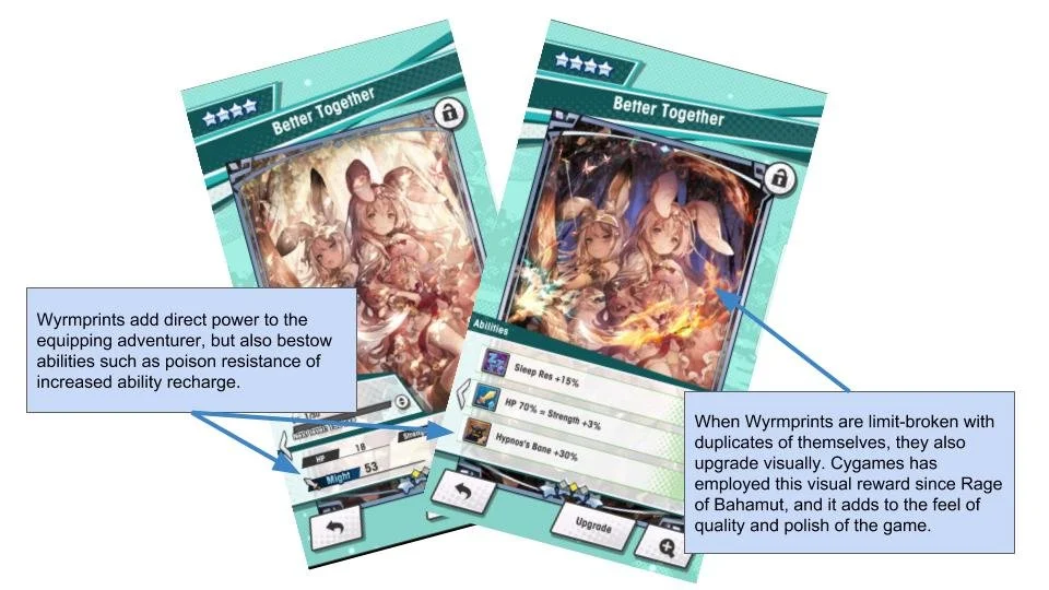 Wyrmprints are equippable trading cards that add or alter the adventurers ability. They, too, can be levelled using their own currency and limit broken with gacha duplicates. This means that to fully level up a 5 star top rarity Wyrmprint, you would need to acquire four duplicates (appearance rate of a specific 5 star Wyrmprint is 0.083% at the time of writing) and then acquire enough specific levelling materials or dud Wyrmcards to feed into them to level them up.