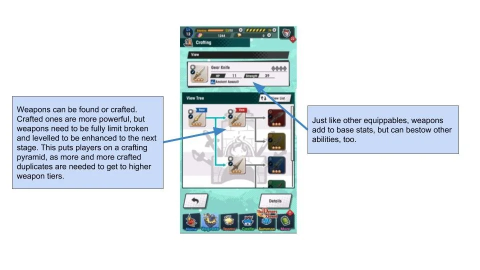 Dependence of the weapon system on the kingdom builder part of Dragalia forces players to have a steady predictable progression metaphor that is based on time, not random drops, until they can craft endgame items.