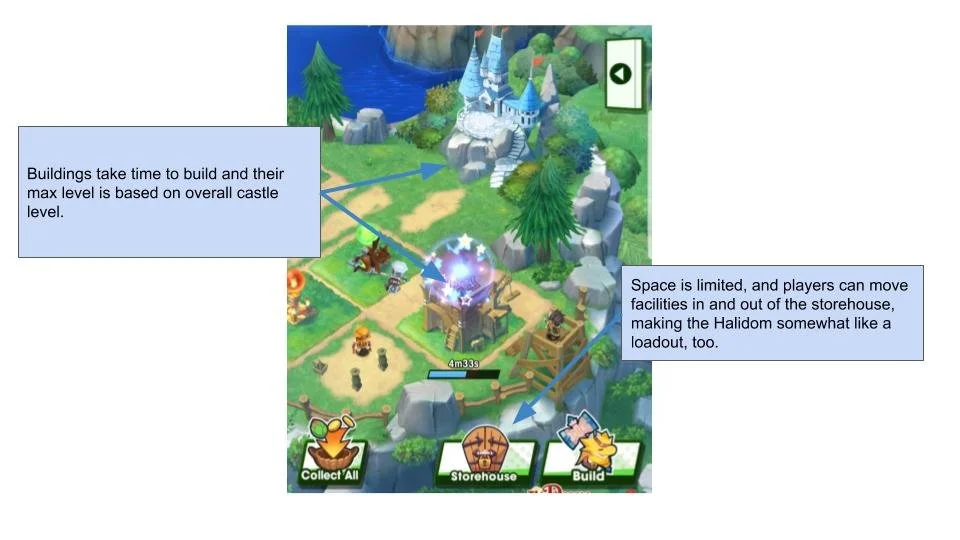 The Halidom is a kingdom builder, and plays by the standard rules of builder conventions. Buildings costs soft currency, time and sometimes crafting materials to build, and there are a limited amount of builders. Building can be finished up quickly for hard currency. Buildings generate resources that can be collected when they are full, and unlock certain features in the game (such as weapon crafting).