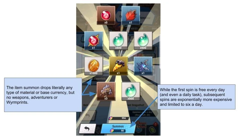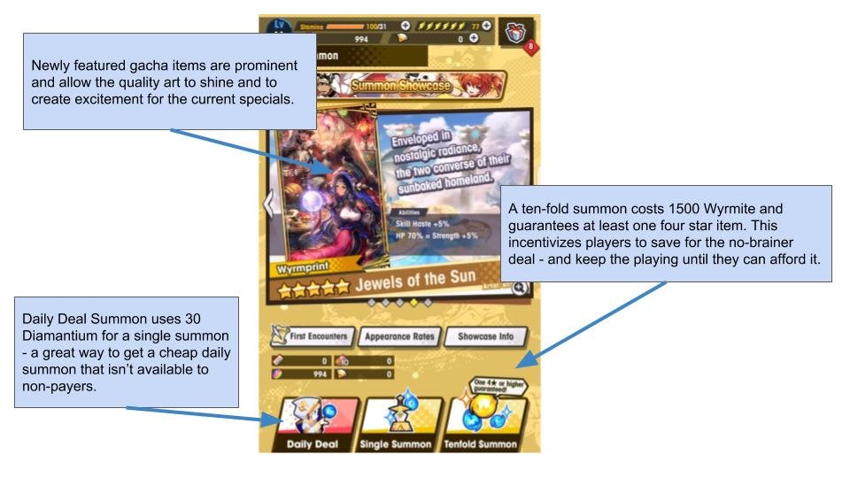 A crafty way to turn more players into payers is the structure of the gacha summons: a single summon is 150 Wyrmite or Diamantium, the ten-fold summon at 1500 Wyrmite/Diamantium guarantees a 4 star item. The daily single summon, however, only costs 30 diamantium, meaning that the paid-for premium currency is vastly superior when used in daily trickles, keeping spenders playing!