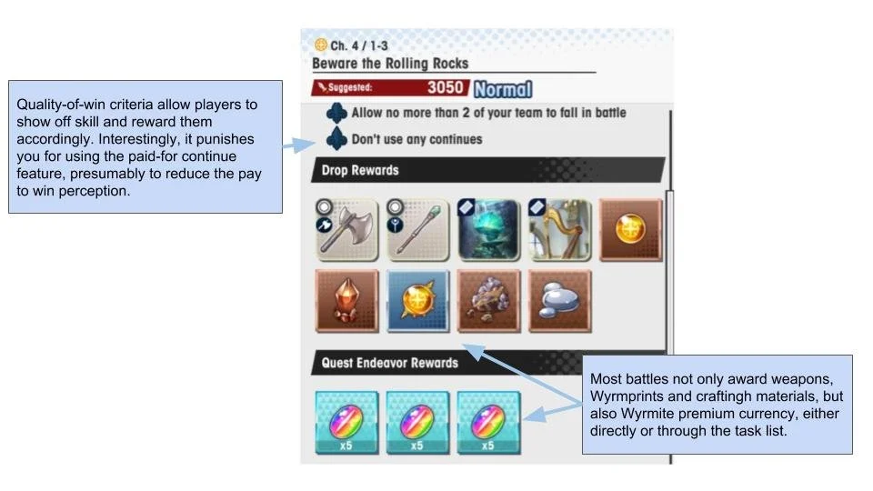 Each time a player fights a battle, they receive a few consistent resources: rupies and mana. On top of this, each level has a drop table of random rewards, that includes weapons and even low-level Wyrmprints. So to find the more tertiary resources only found in drop tables, players need to not only select the right level and fight difficulty, but also get lucky.