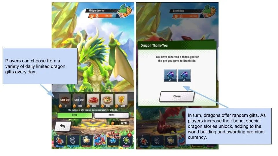 Since Dragon gifts are not very predictable or good return of investment, they are not a good way for the player to advance their progress. However, Talonstones, as pictured above, are given at certain bond levels, which makes leveling dragons relevant at specific points in the upgrade journey.