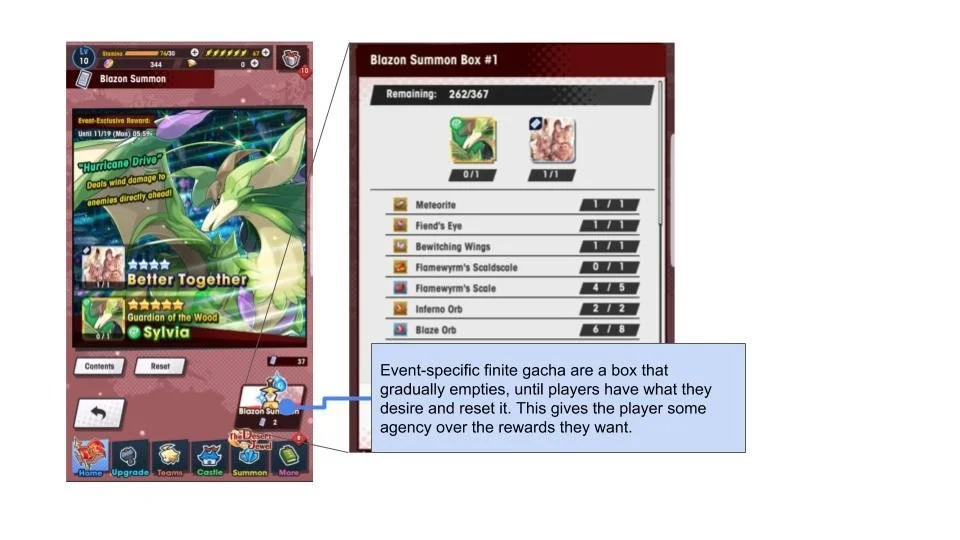 If players need to desperately acquire a certain resource, they have the choice to either fight for randomized these rewards and potentially spend on stamina refills, or they have to buy these resources in shop packs and the item gacha.
