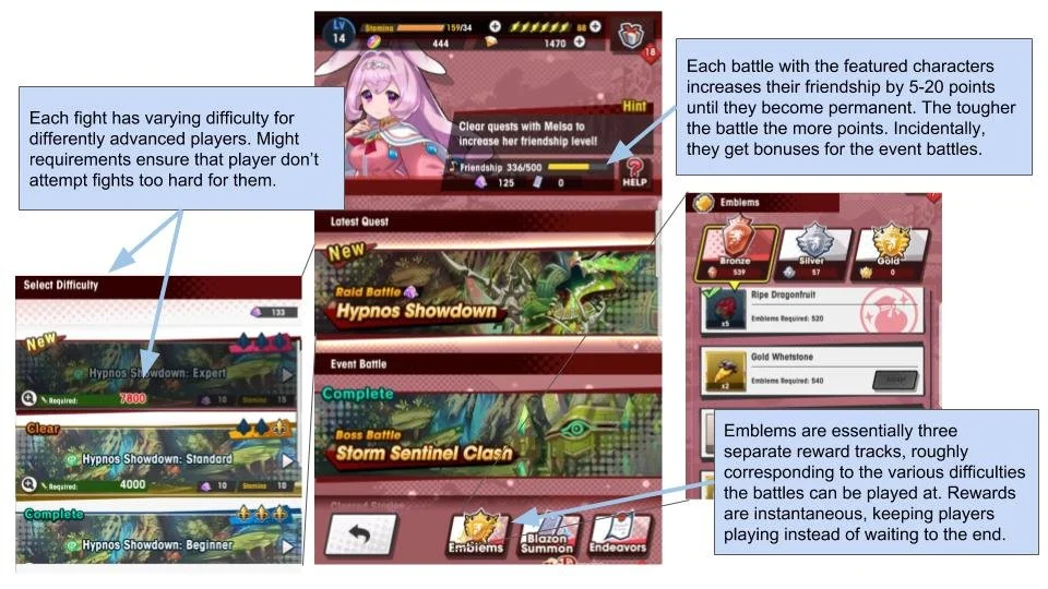 Boss Battles can be completed on their own or in coop mode and hence allow players who do not want or are not able to participate in synchronous coop to earn event gacha currency, emblems (engagement rewards) and raid access tickets.