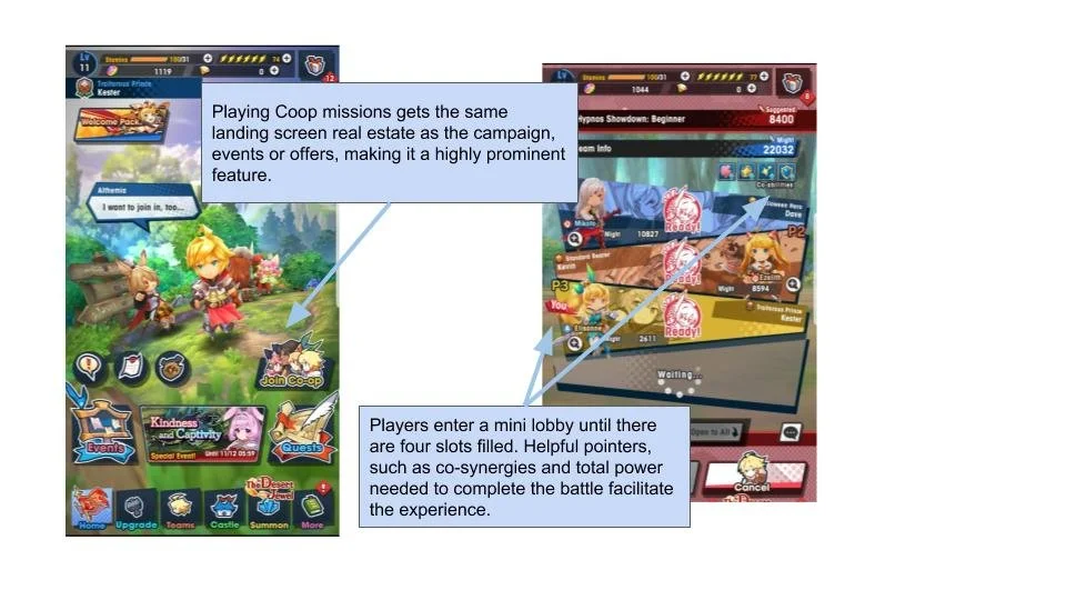 Almost every battle, whether campaign or event, can be fought in synchronous coop mode with other players. Some modes only allow one hero (of four), others feature multi-team raids of 12 characters. Coop follows a classical lobby system, with all its drawback of waiting and dud players.