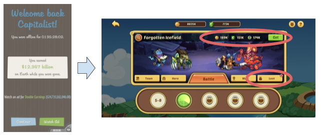 Example idle progress collection in AdVenture Capitalist vs. Idle Heroes