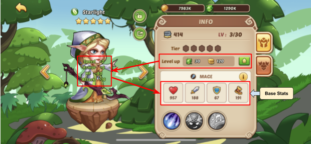 Level-ups increase the four base stats of each hero: