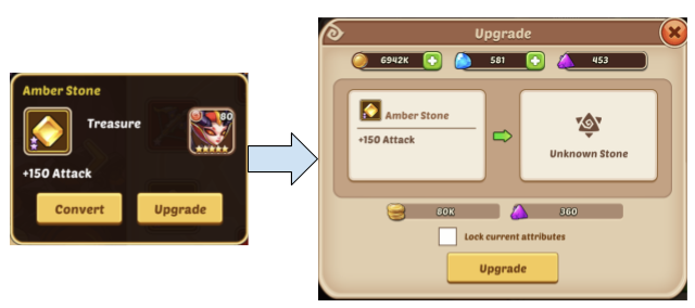 In the image below, you can see two choices for upgrading the stone equipment item: 1. “Convert” or 2. “Upgrade”. Upgrading will increase the bonus amount received upon paying the upgrade cost which is shown in the modal on the right. Convert refers to changing the type of bonus that the stone gives. Every time a stone is upgraded the RNG portion of the upgrade involves randomly determining the bonus type.