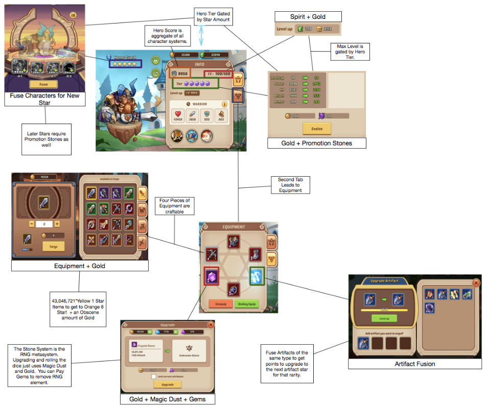 The core metagame features were clearly inspired by Heroes Charge (which was itself inspired by the China-only hit DOTA Legends). The list below lists an overview of the core metagame features in Idle Heroes.