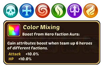 As an example, “Color Mixing” will give a bonus if a hero from each color is used in the team: