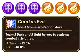 The “Good vs. Evil” aura activates when 3 dark (purple) and 3 light (orange) heroes are used in a team: