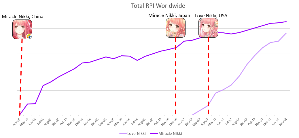 Total Revenue Per Install shows constant growth as well. Here you can see that the Western version, Love Nikki, is almost at the level of the Asian Miracle Nikki, with the US around 5$ per install.