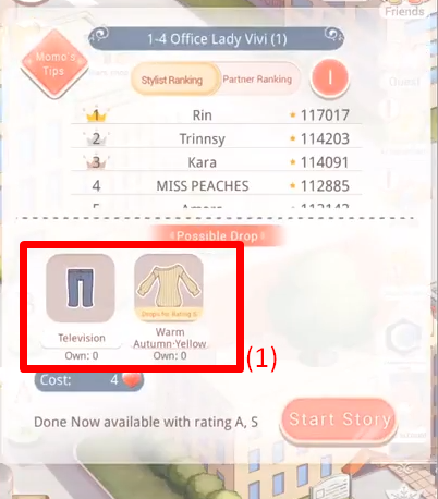 The game shows tips with the suggested clothes for the medium (B,C,A) and top scores (S). Normally they can be crafted from the materials the player got earlier or bought in the shop. If a player is missing any item, the game will gladly UI-lead the way over to where to get it.