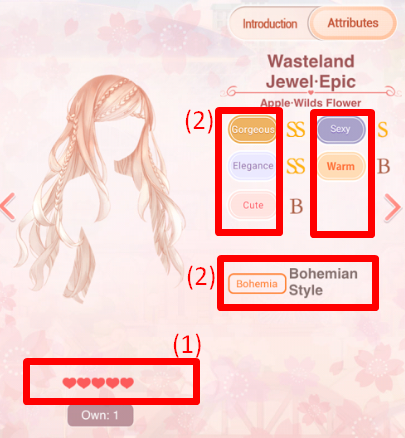 Rarity (on the image (1)) - defines the value of each clothes. Represented in hearts. The more hearts there are (up to 6) - the more rare the item is. Golden hearts indicate animated clothes, and are mainly found in Live Ops.