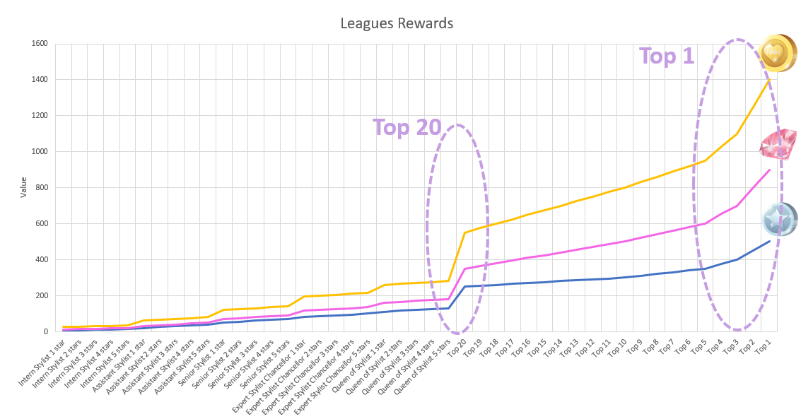 Rewards are heavily differentiated between the league and the top 20 players. This is the main driver to become a Top 20, as just the 20th position can double the rewards compared to leagues.