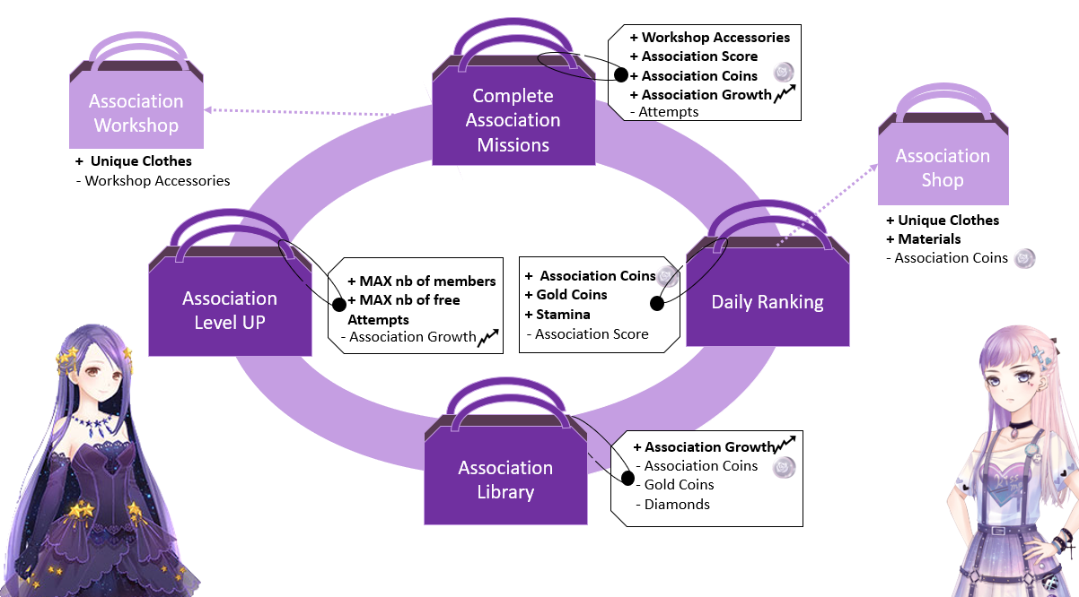 - All Inclusive: every feature contributes to the final wardrobe collection and has exclusive shops with their own unique currencies and content.